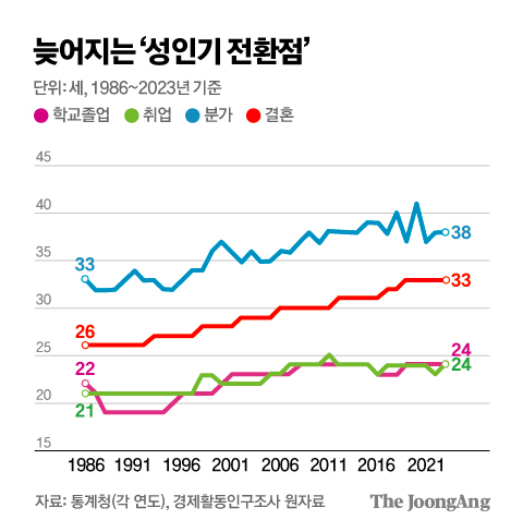 '취업'을 통한 경제 독립과 '결혼'을 통한 가구 독립이 늦어지는 현상이 원인으로 분석된다. 성인기로의 전환점인 ▶학교 졸업 ▶취업 ▶결혼 ▶분가 4개 지표 모두 1986년에서 2021년까지 느려지는 우상향 그래프를 그렸다. 변금선 서울연구원 연구위원은 "최근으로 올수록 4개 지표 생애 첫 전환 연령이 높아지는 양상을 보이는데, 성인으로의 이행 지연을 보여주는 결과"라고 설명했다.