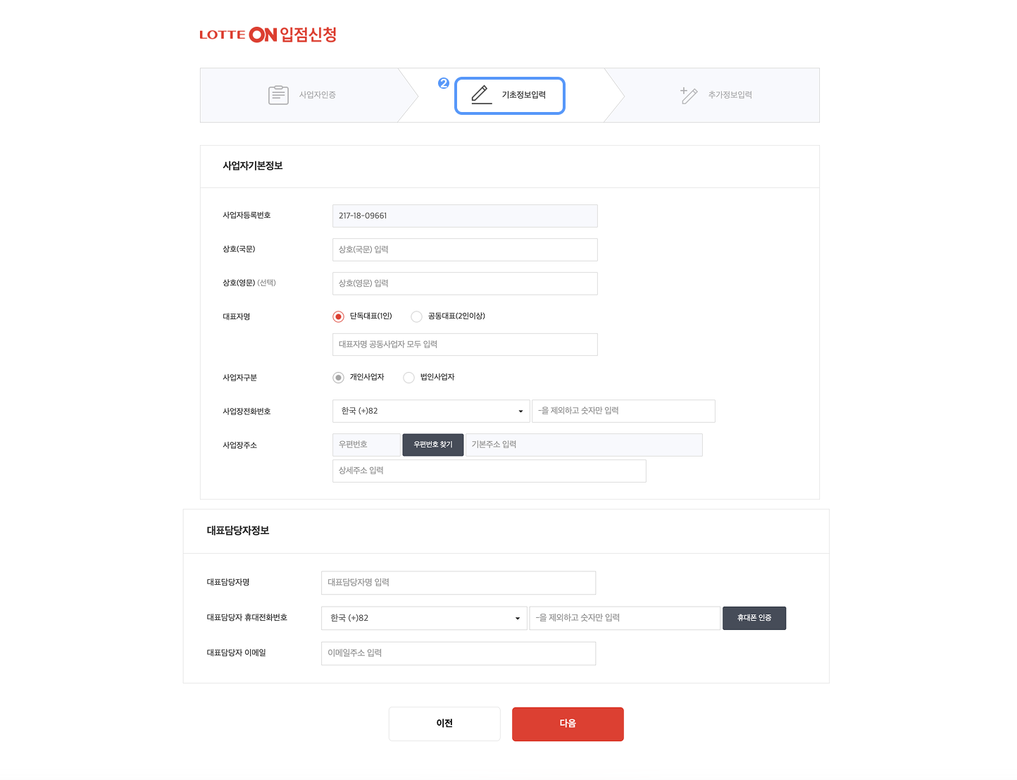 그 다음으로는 기초정보 입력 단계예요. 상호명, 담당자 정보 등을 포함한 정보들을 입력해주세요.