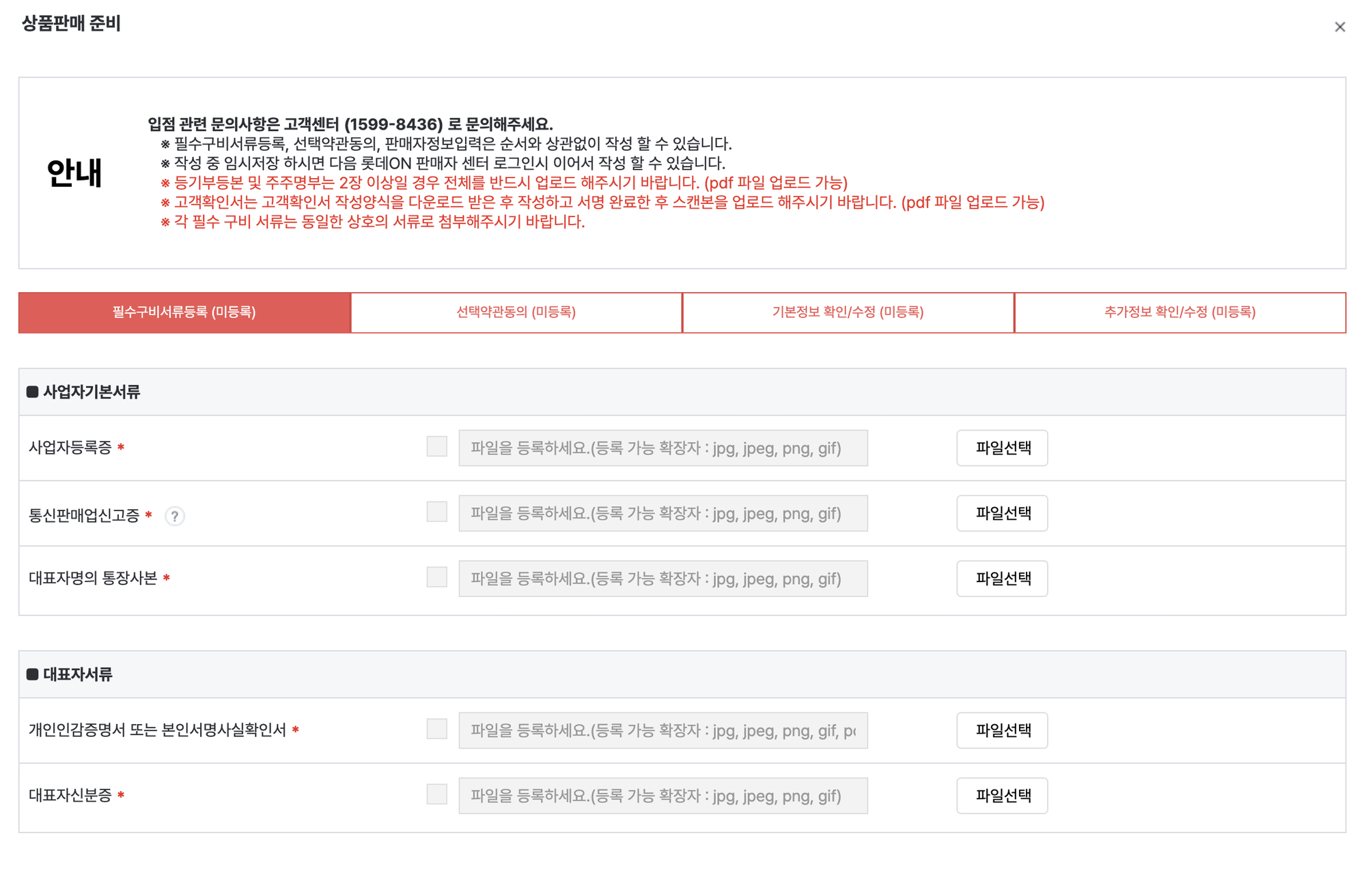 입점신청 후, 롯데온 판매자센터를 재접속하면 자동으로 서류등록을 할 수 있는 창이 팝업되는데요. 제일 먼저 사업자등록증, 통신판매업신고증, 통장사본, 인감증명서(혹은 본인서명사실확인서), 신분증 사본을 등록해주세요.