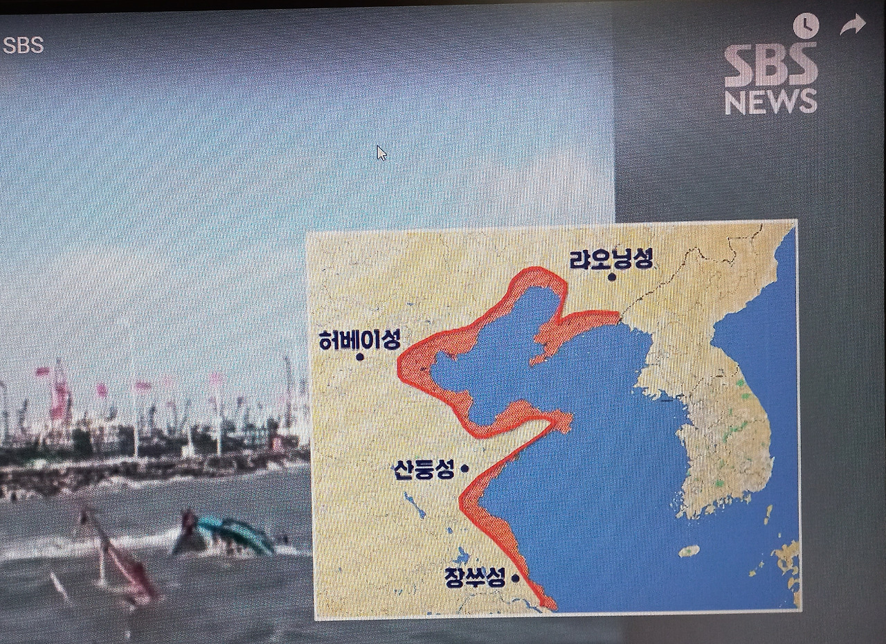 중국 해안에 밀물 홍수가 일어난 지역을 붉은색으로 나타낸다. 더구나 이날 중국 해안에는 동남풍까지 강하게 불었기 때문에 밀물을 더 밀어올린 것으로 판단되고 있다. (SBS 영상)