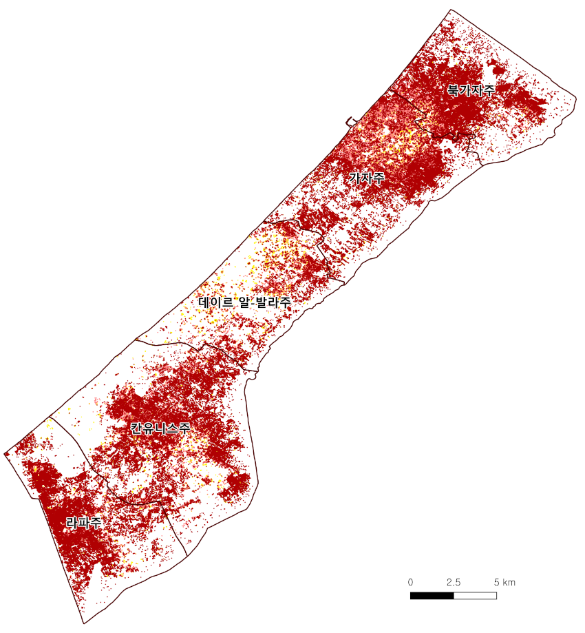 UN위성센터는 가자지구 총 건물의 78% 정도가 파괴됐다고 추정했다. 거의 대부분의 건물이 다시 쓸 수 없는 수준이다. 공습이 가장 오래 지속된 가자주는 건물 피해 규모가 83%에 달한다. 다섯 개 행정구역 중 가장 크다. 이스라엘의 폭격과 철거 작업은 이달까지도 대대적으로 이뤄졌기에, 피해규모는 이보다 더 클 것으로 보인다.