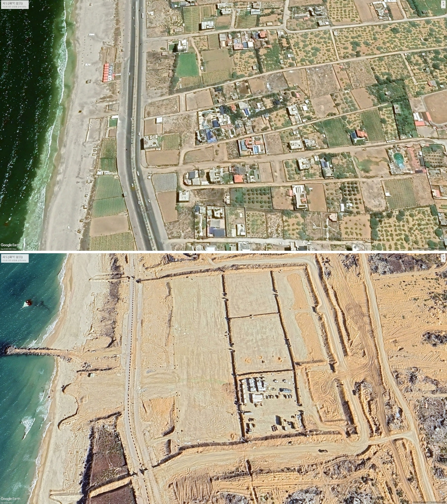 가자주 가자시 남부 한 해변의 변화. 2023년 8월 10일(위)과 2024년 12월 1일 사진. ⓒ구글어스