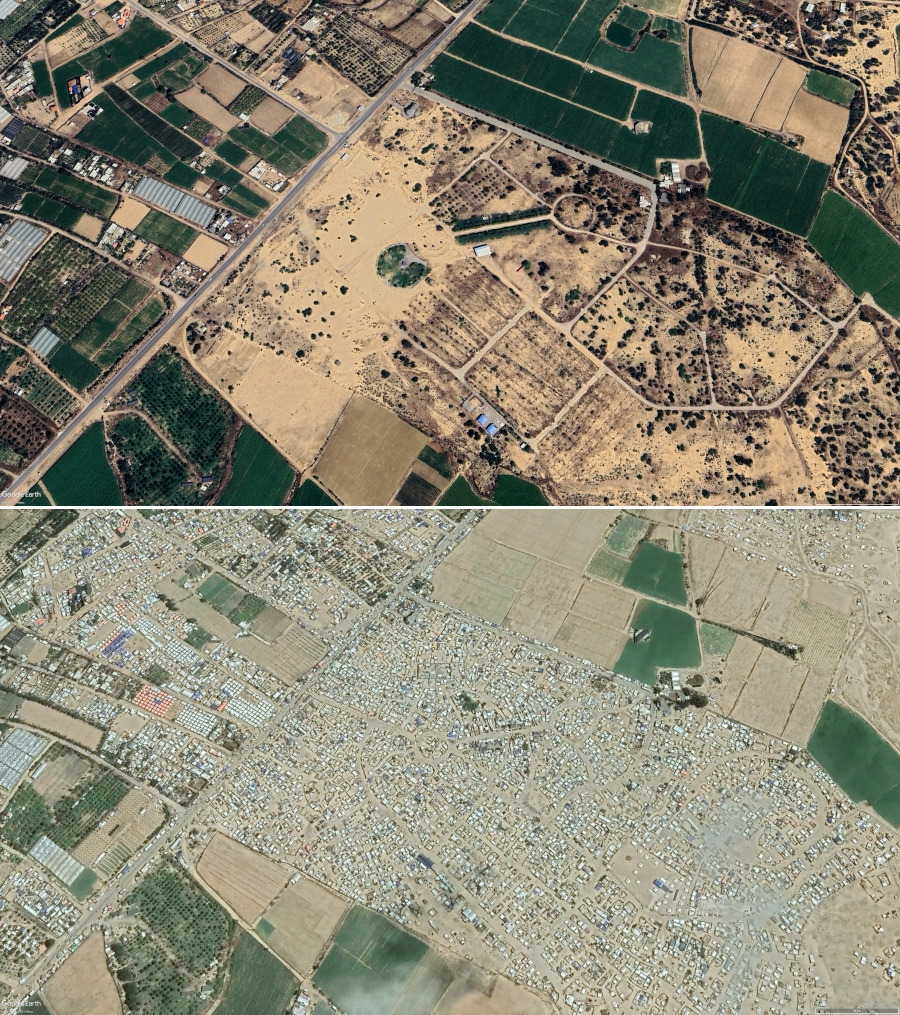 가자 남부 칸유니스주 알마와시(Al Mawasi)의 한 해변 마을은 전쟁 후 난민촌이 됐다. 이 마을을 보면 백사장부터 마을 내 초지, 나지, 농지까지 가릴 것 없이 모든 공터에 난민 텐트가 빼곡히 들어섰다.