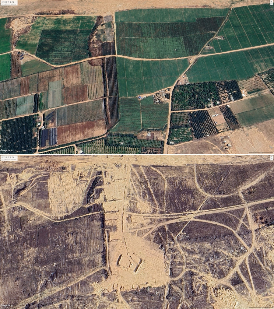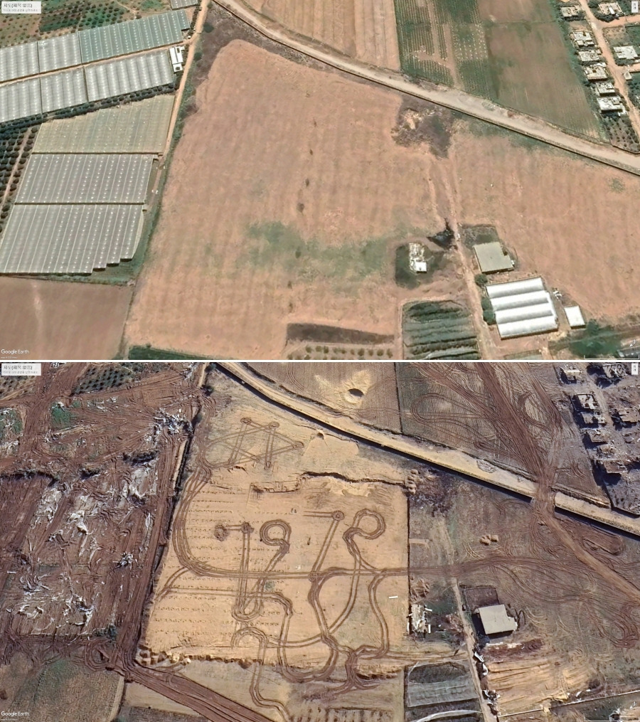 이곳은 현재 이스라엘군이 중장비로 땅을 다진 흔적으로 가득하다. 과거 작물이 자라던 밭의 모습은 사라졌고 장갑차, 탱크, 굴착기 등의 바퀴 자국이 무성하게 남아 있다. 이 농지 한복판엔 가로, 세로 60여 미터(m) 길이로 흙 둑을 쌓아 올린 구조물도 눈에 띈다. 이스라엘군의 임시 주둔지로 보인다.