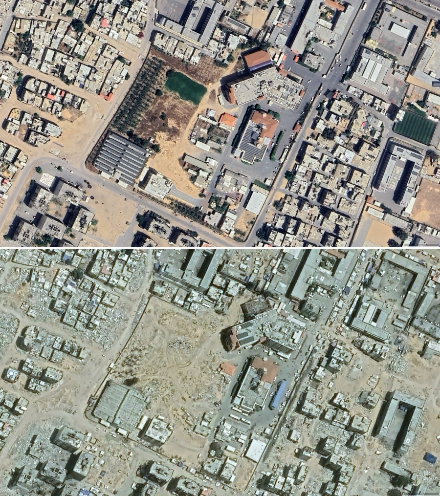 남부 칸유니스주도 최근까지 집중 공습을 당해 대규모 피해가 양산됐다. 칸유니스 시청에서 1km 가량 떨어진 위 지역의 위성 사진은 전쟁 이후 폐허가 된 도심을 보여준다. 2023년 8월 건물이 빼곡했던 풍경은 2024년 6월 대다수 건물이 파괴돼 잔해로 부서져 회색빛으로 변했다. 건물 밀도도 크게 변했다.