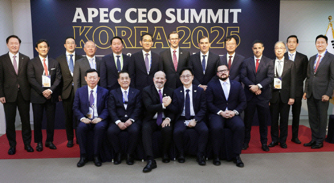 김정관 산업통상부 장관(앞줄 오른쪽 두번째)이 2025년 10월 29일 경북 경주시 예술의 전당에서 하워드 러트닉 미국 상무부 장관(가운데)과 이재용 삼성전자 회장(뒷줄 왼쪽 여섯번째)·정의선 현대자동차그룹 회장(네번째)·최태원 SK그룹 회장(다섯번째)·구광모 LG그룹 회장(세번째) 등 국내 주요기업 최고경영자(CEO)가 참석한 가운데 열린 서밋 비즈니스 라운드테이블에 참석, 기념사진을 찍고 있다./산업통상부 제공