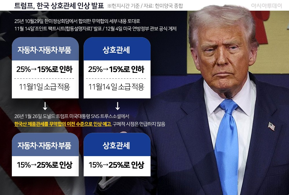 ◇ 트럼프 "韓 국회, 약속 안 지켜"… 관세 15%→25% '복원' 선언